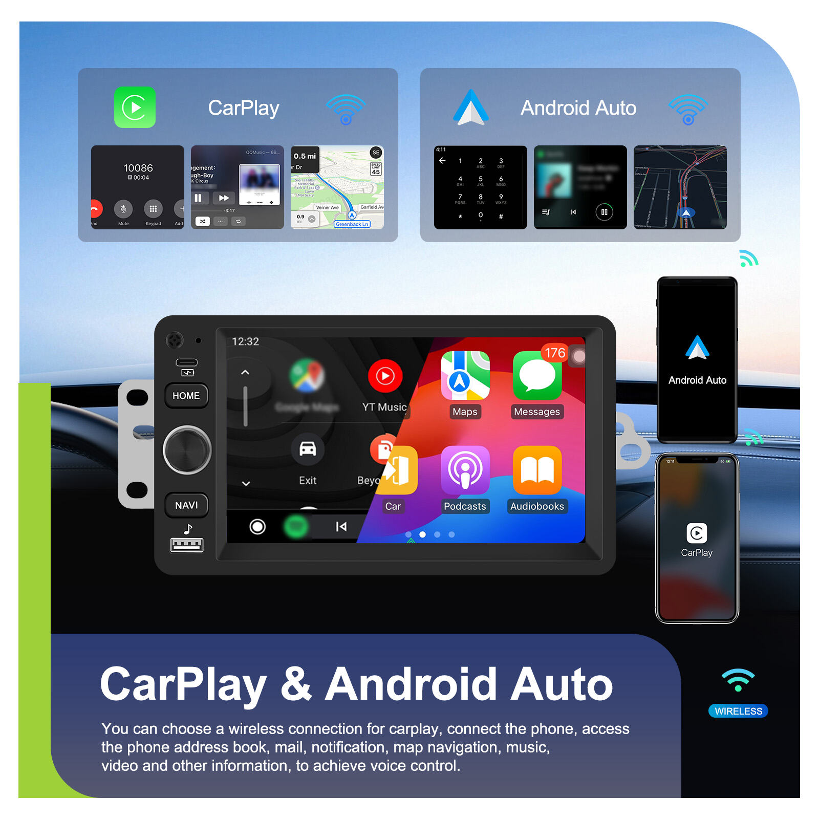 - CarPlay Nirkabel & Android Auto: Panggilan bebas genggam, navigasi, musik