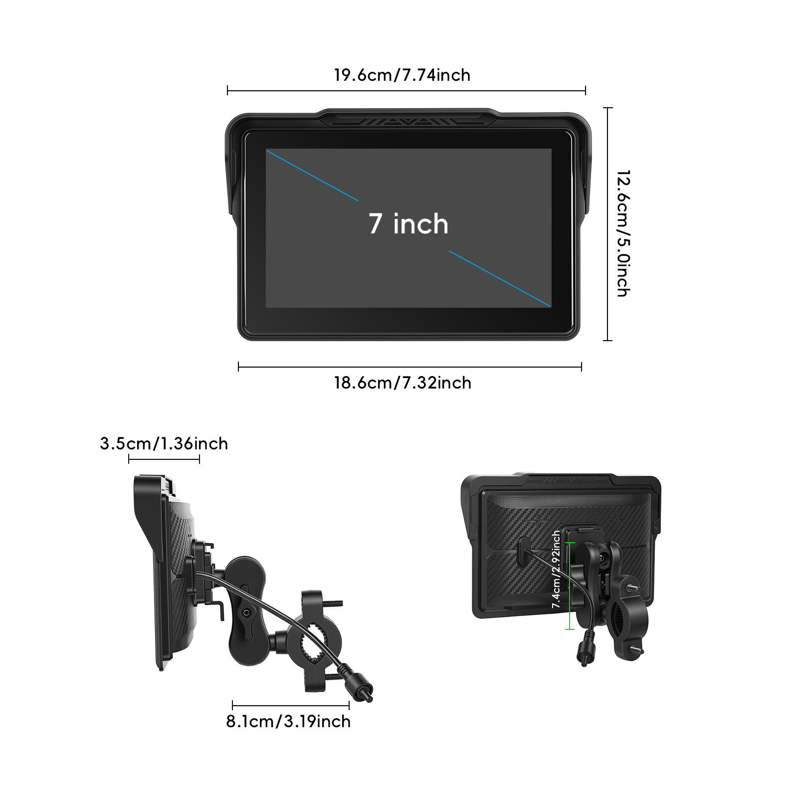 Unità centrale per moto Podofo da 7" con touchscreen, CarPlay wireless, Android Auto, AirPlay e TPMS impermeabile IP68, OEM A4564