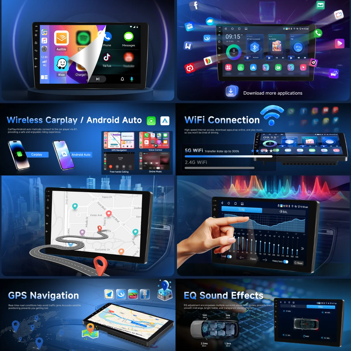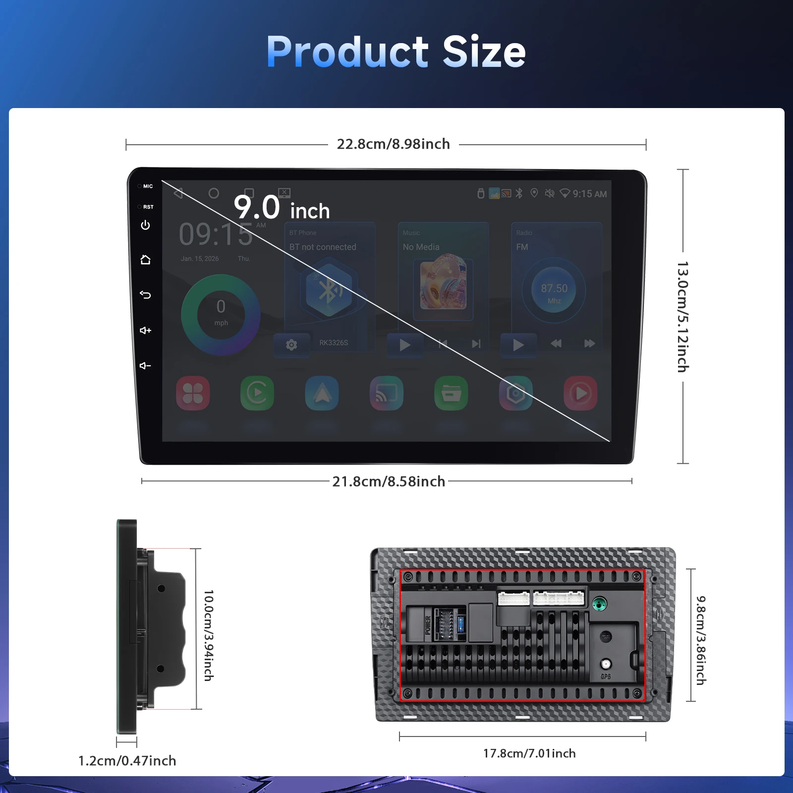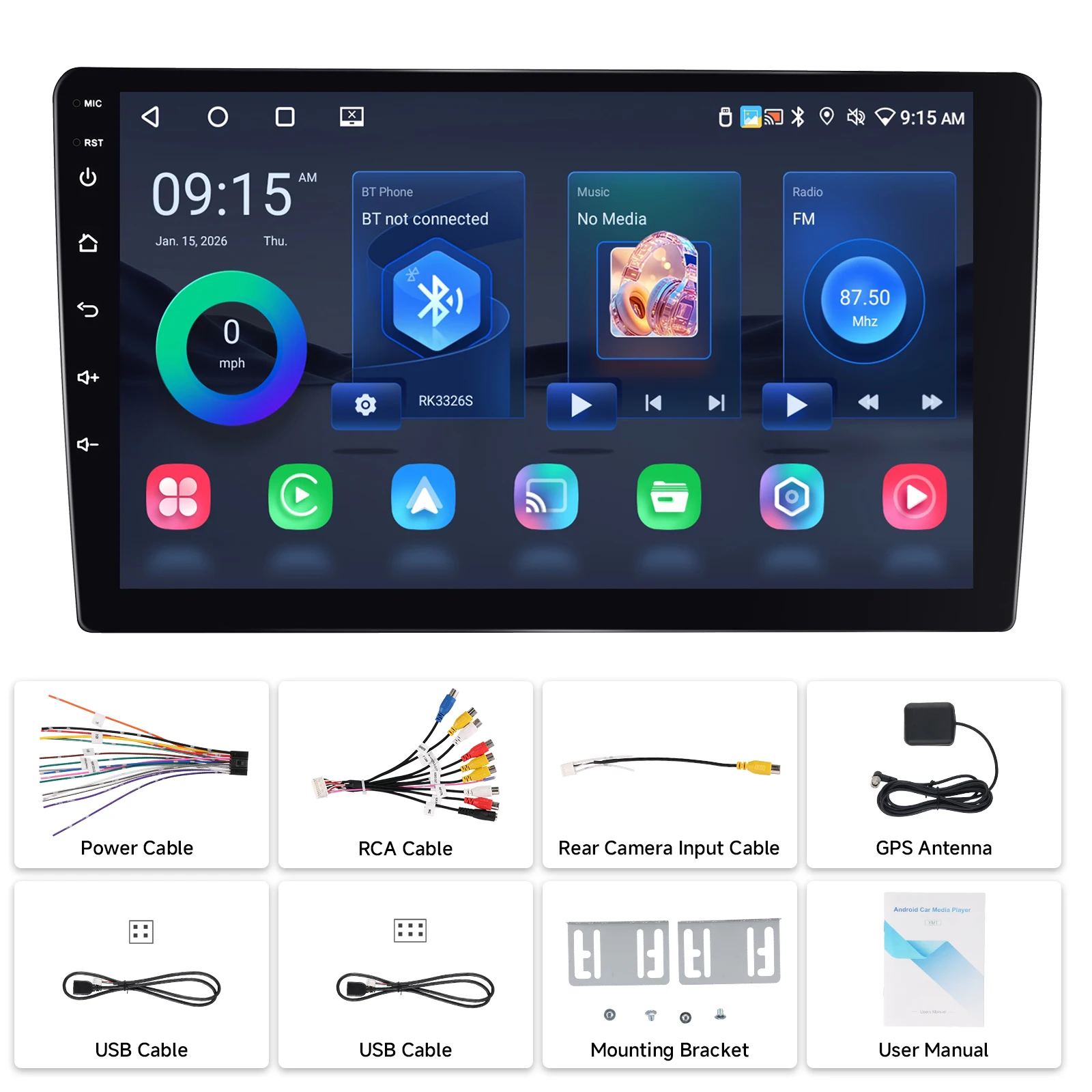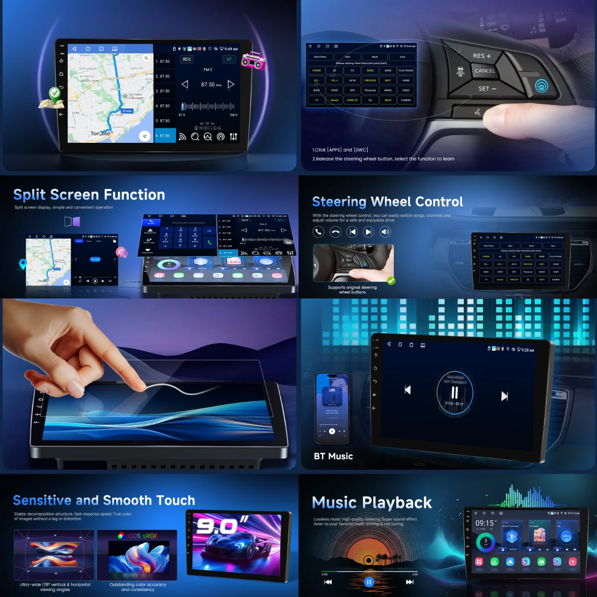 - 9インチHDタッチスクリーン:1280×720解像度、高感度操作