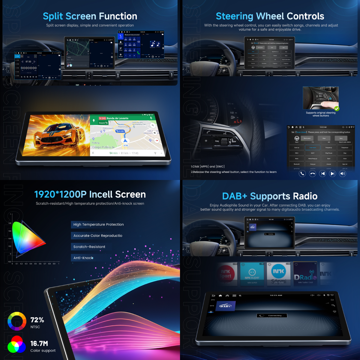 - Wireless CarPlay & Android Auto Connect your iPhone or Android phone wirelessly to access navigation, music, calls, and messages directly on the large screen - a truly convenient and cable-free integration