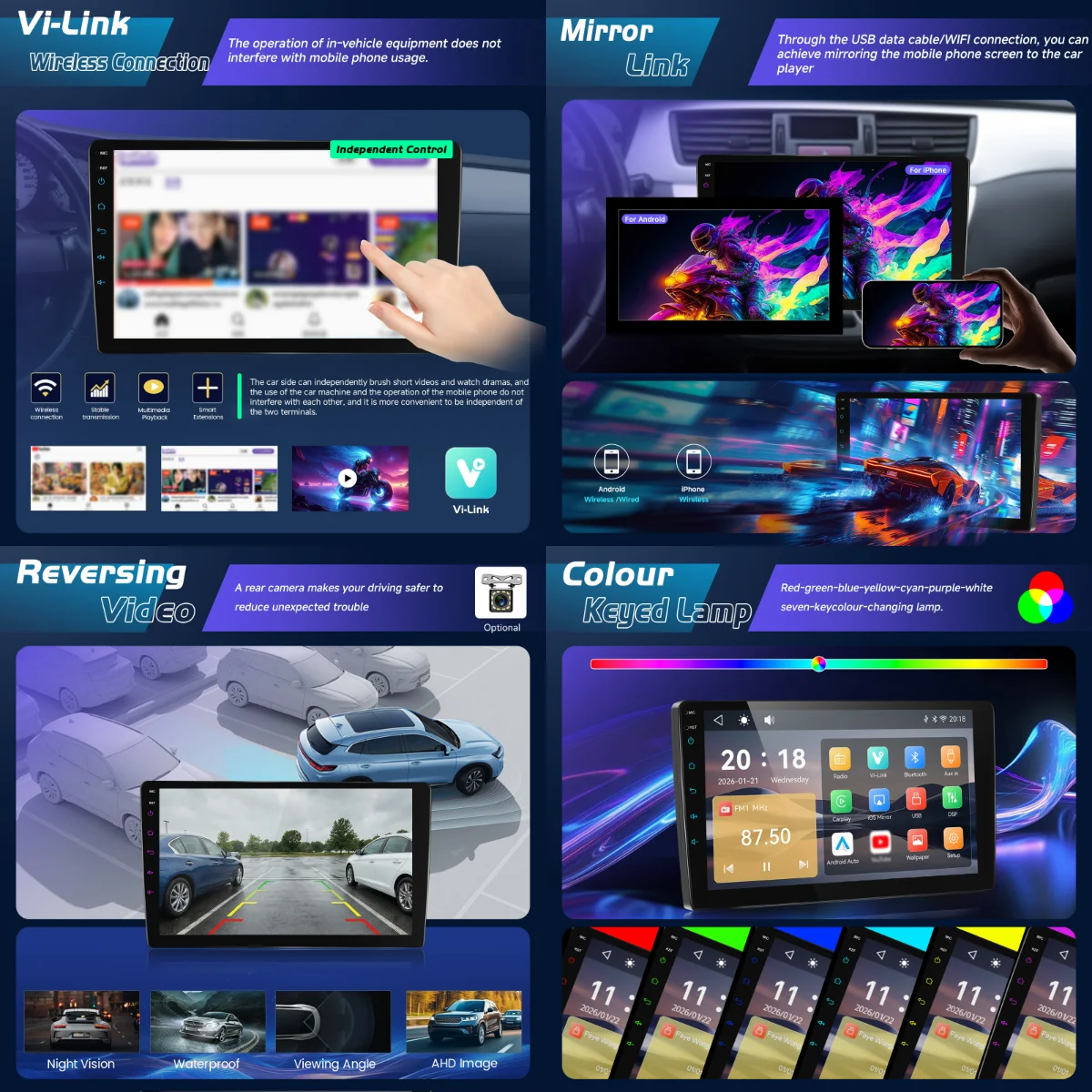 - Vi-Link Wireless Connection: Phone connects to car WiFi for screen casting, independent operation of car and phone
