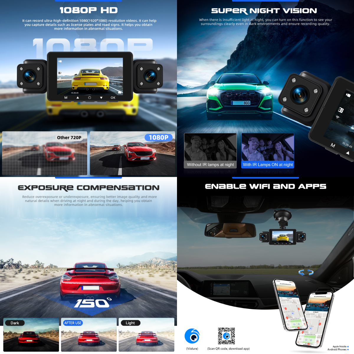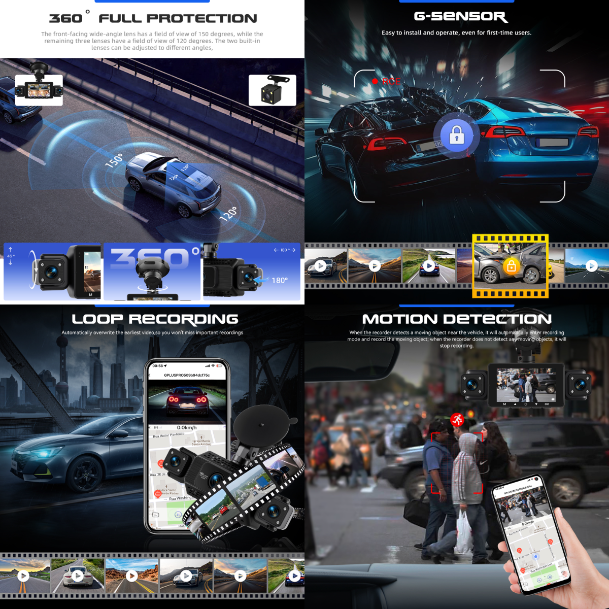 - Four Cameras: Front two lenses adjustable, 360° coverage with no blind spots