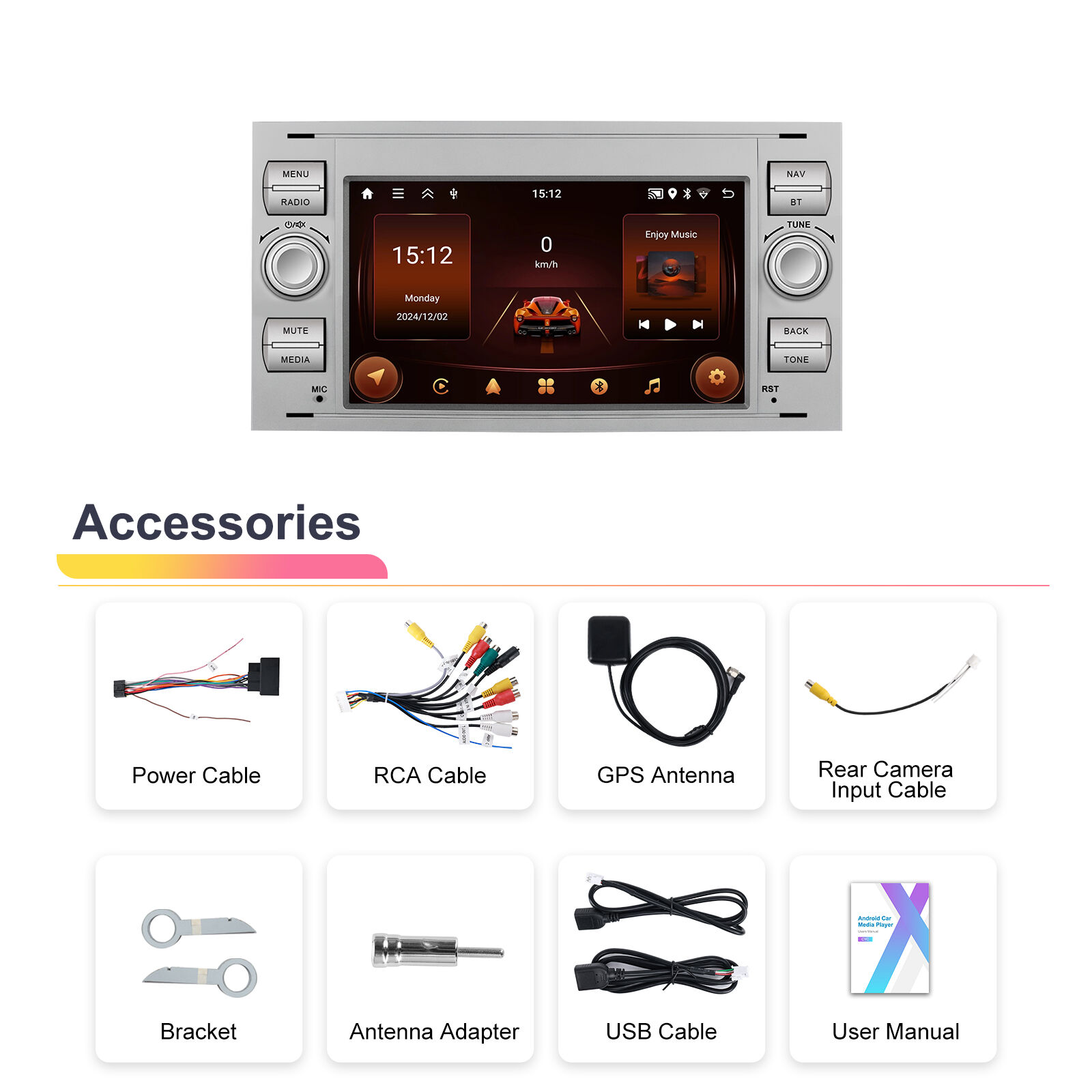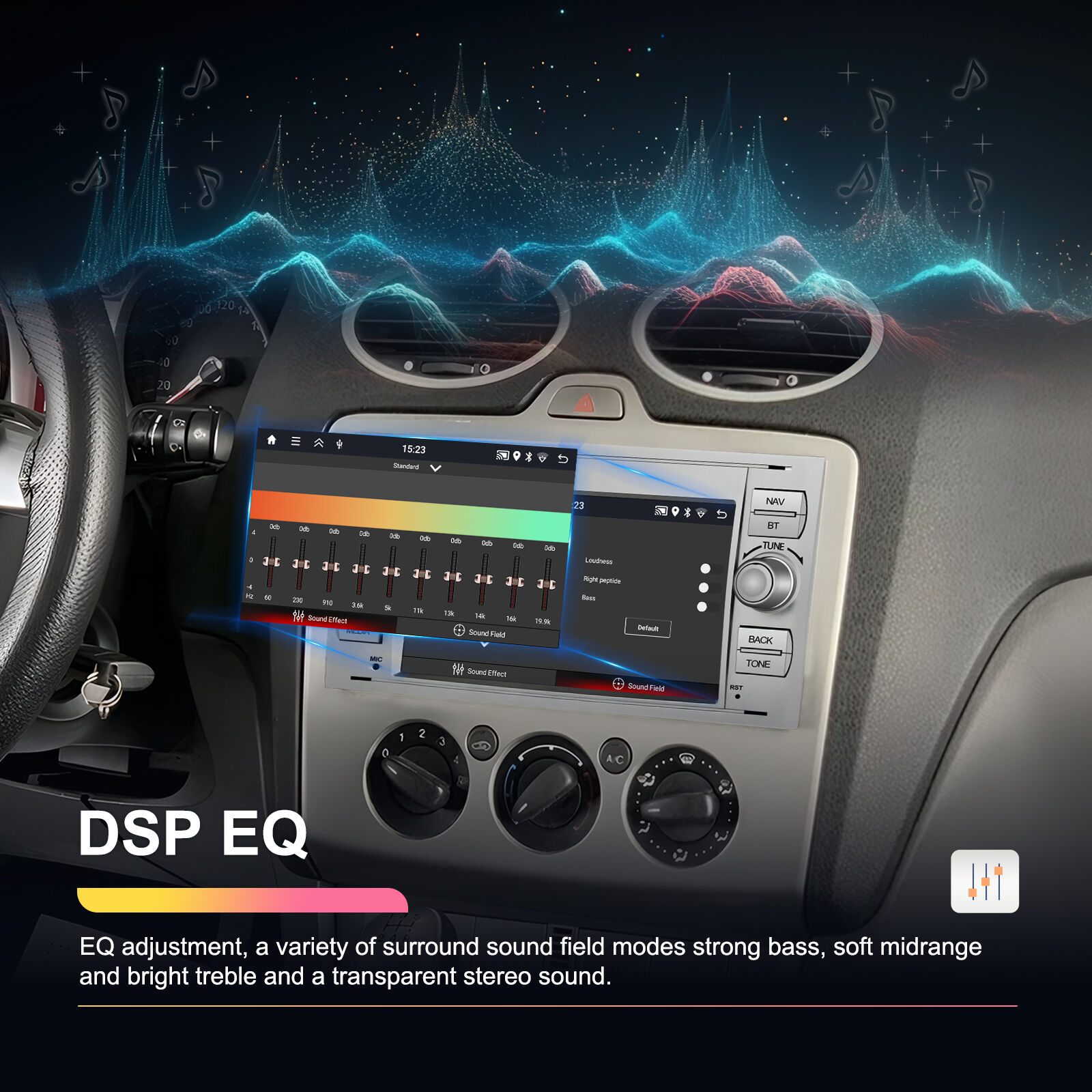Podofo 7'' Android Carplay Android Auto Car Stereo 2+64G Car Radio BT WIFI GPS EQ FM RDS for Ford Transit Fiesta Focus Galaxy A3718WE/A3718BK