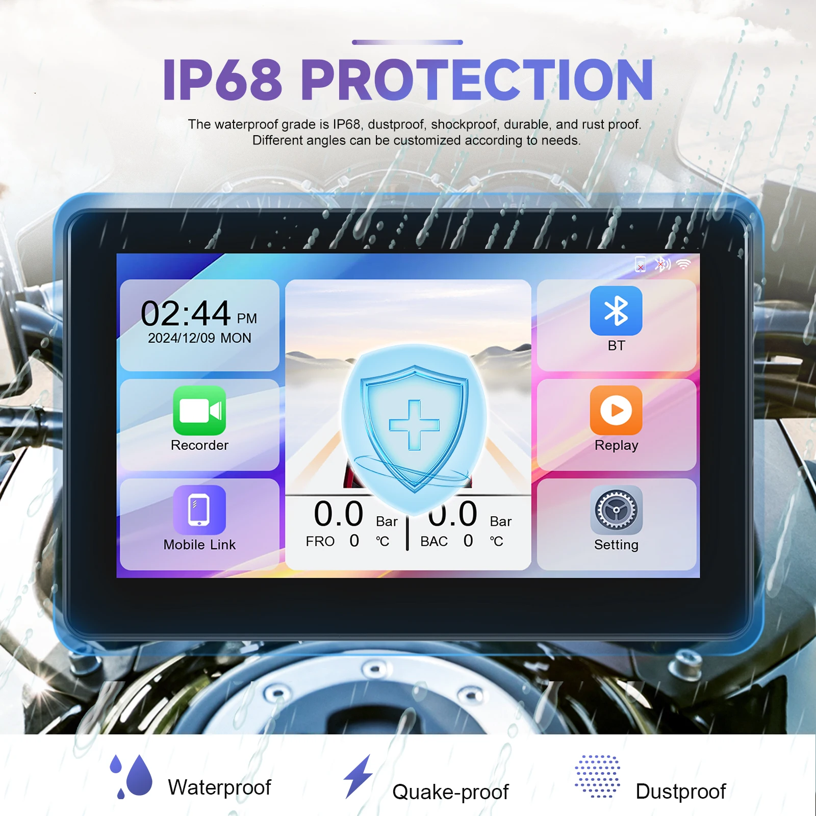 Podofo 7 Inch Motorcycle DVR Portable Wireless Carplay Android Auto Rear + Front Camera Pressure Detection Autoradio A4036