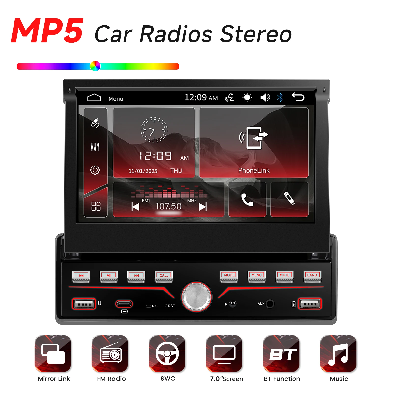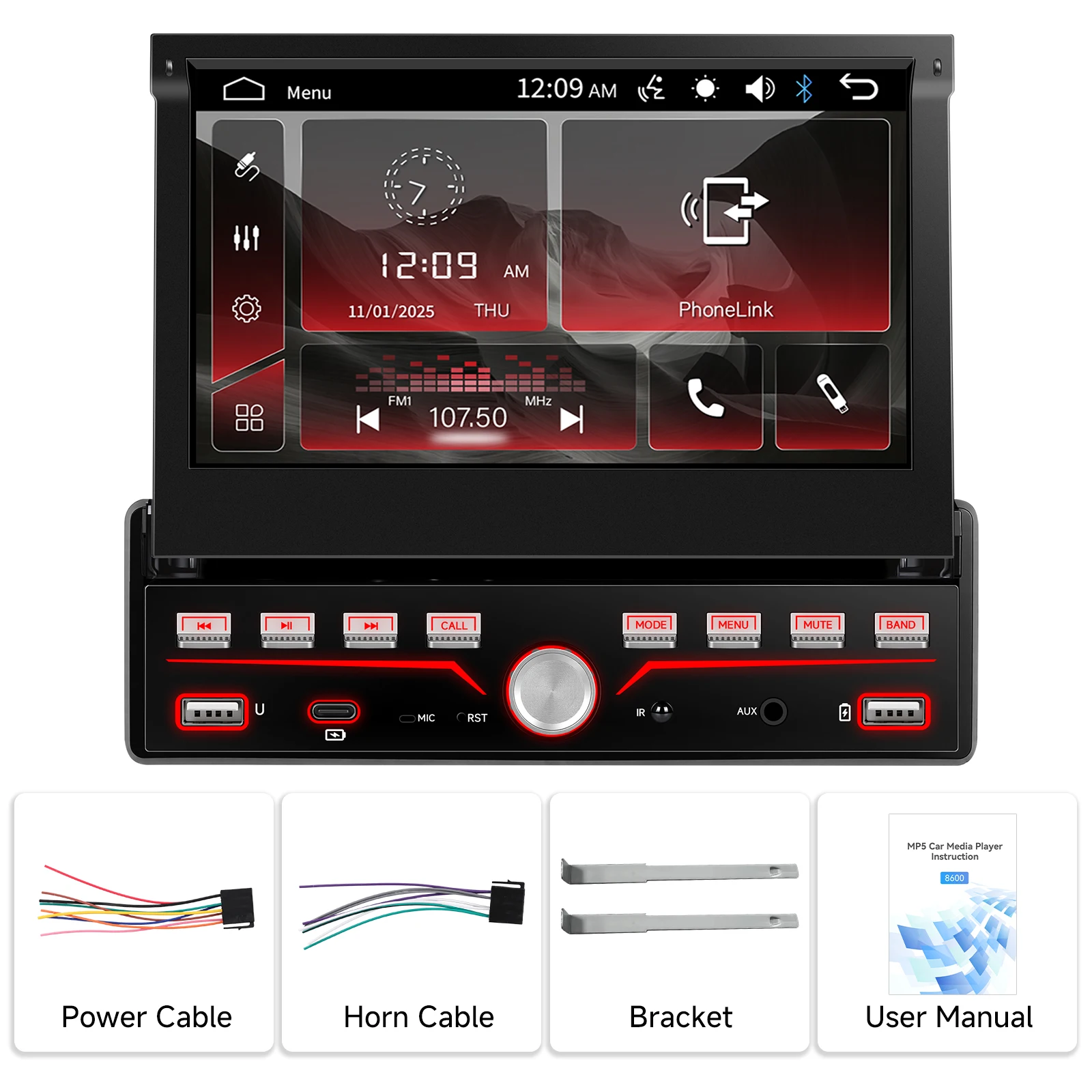 - 7-inch Retractable Touchscreen: Adjustable viewing angle, protects display when idle, clutter-free dashboard