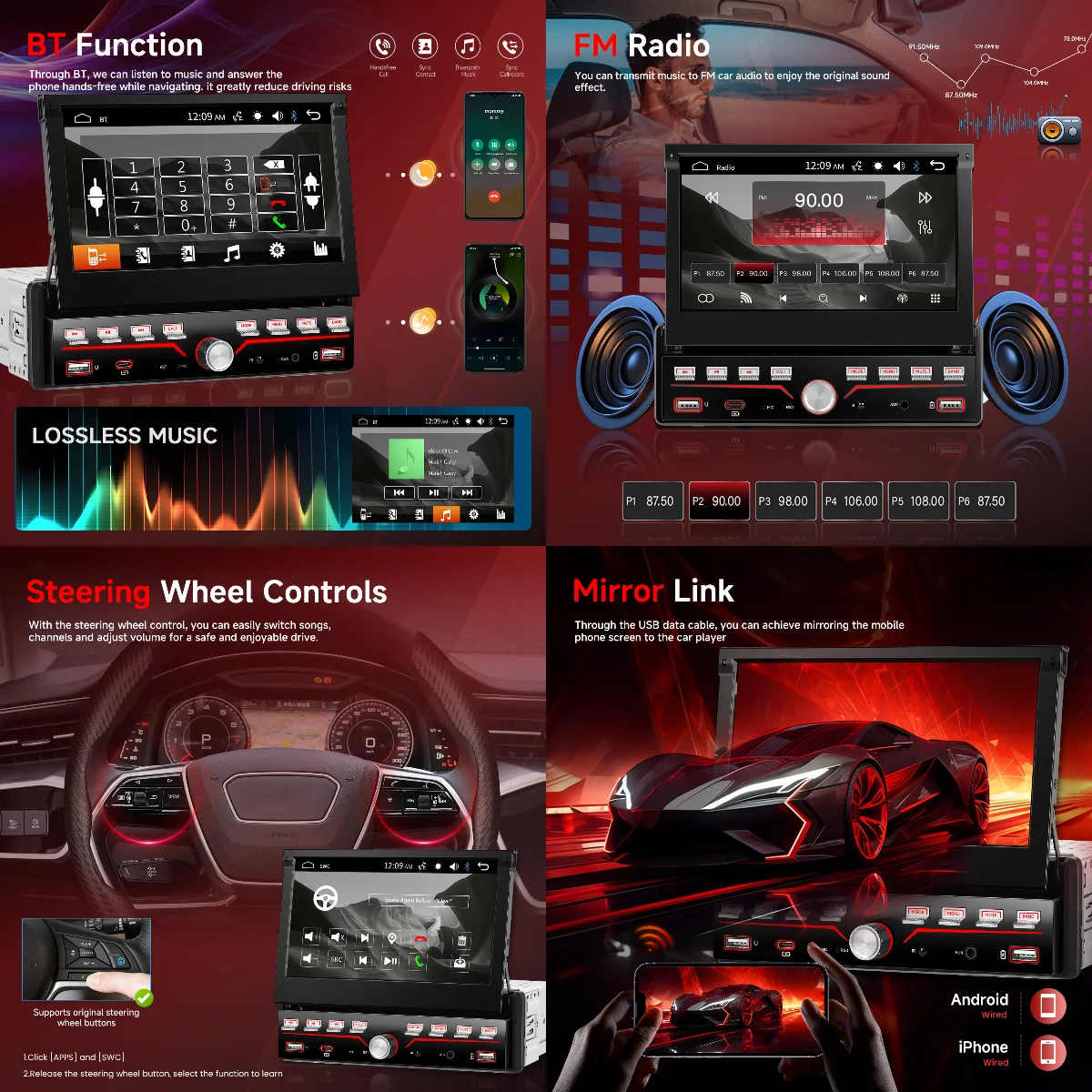- Wired Mirror Link: iOS/Android screen mirroring, share videos, photos, music