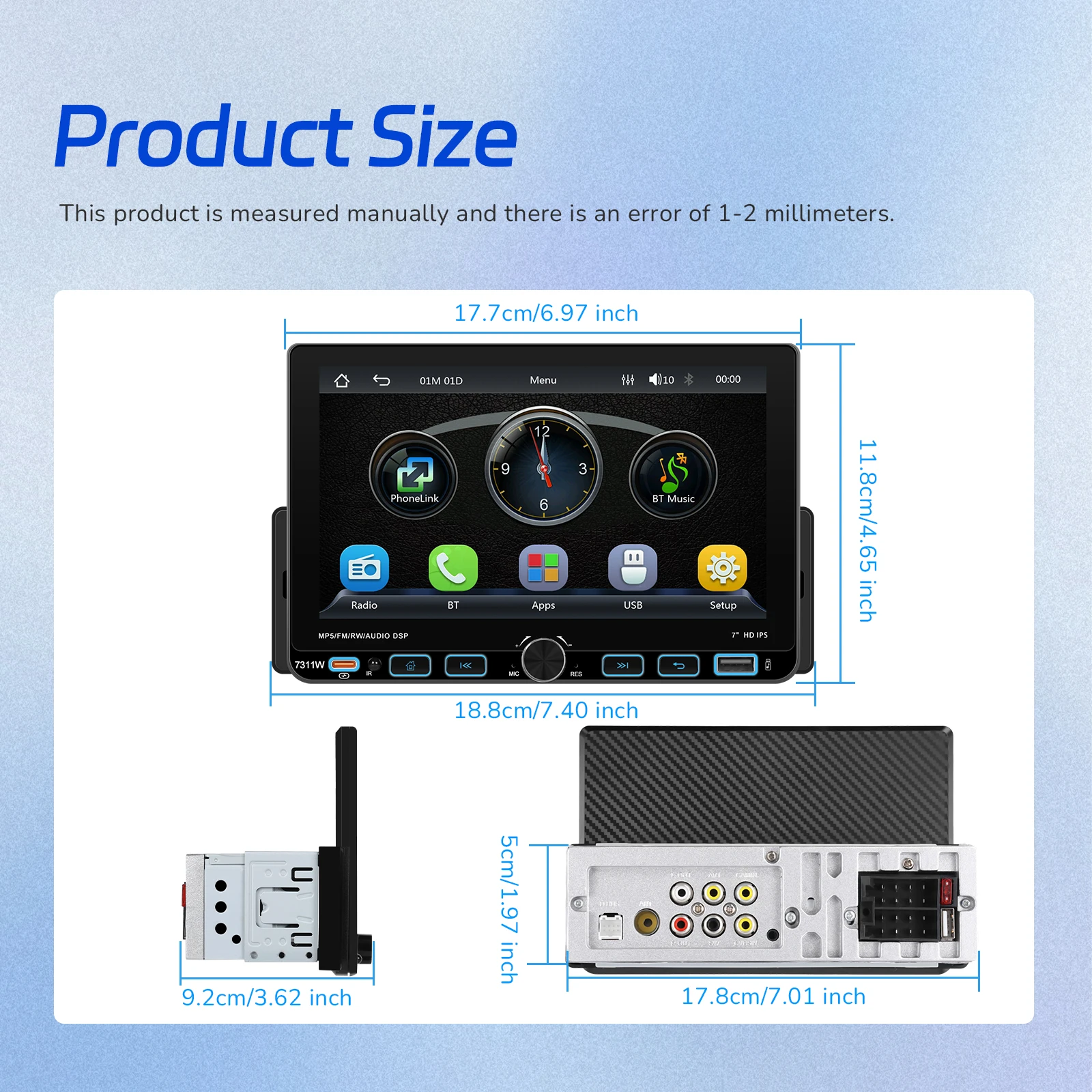 Podofo 7'' Single Din Car Stereo Wireless Carplay Android Auto Car Radio Car MP5 Player BT FM/AM/RDS Type-c/USB ODM Factory A4585
