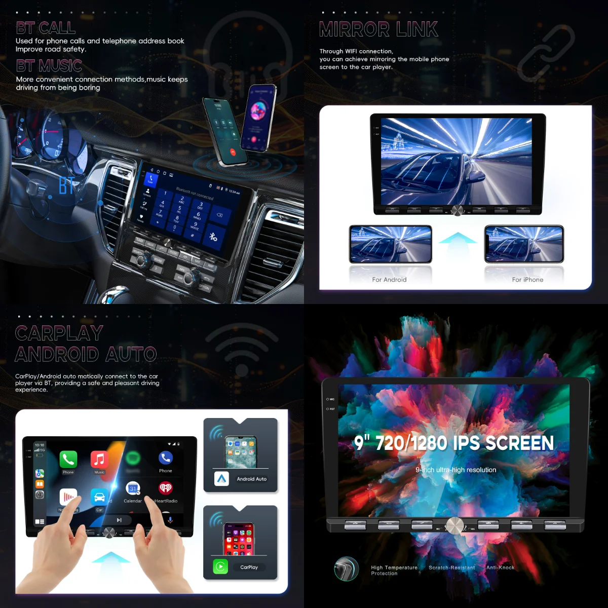 - 9-inch HD Touchscreen: 1280x720 resolution, responsive control