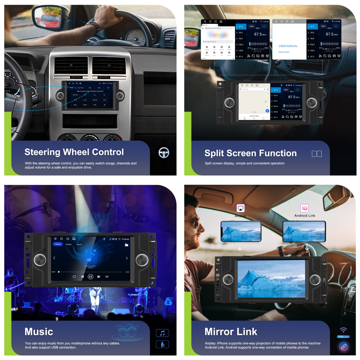 - Wireless Mirror Link: Use phone apps, music, videos on car display