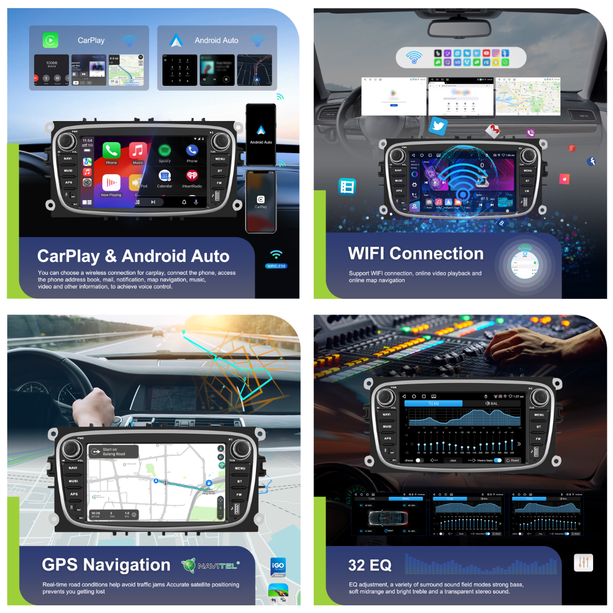 - Wireless CarPlay & Android Auto: Hands-Free Calls, Music, Navigation, Voice Control