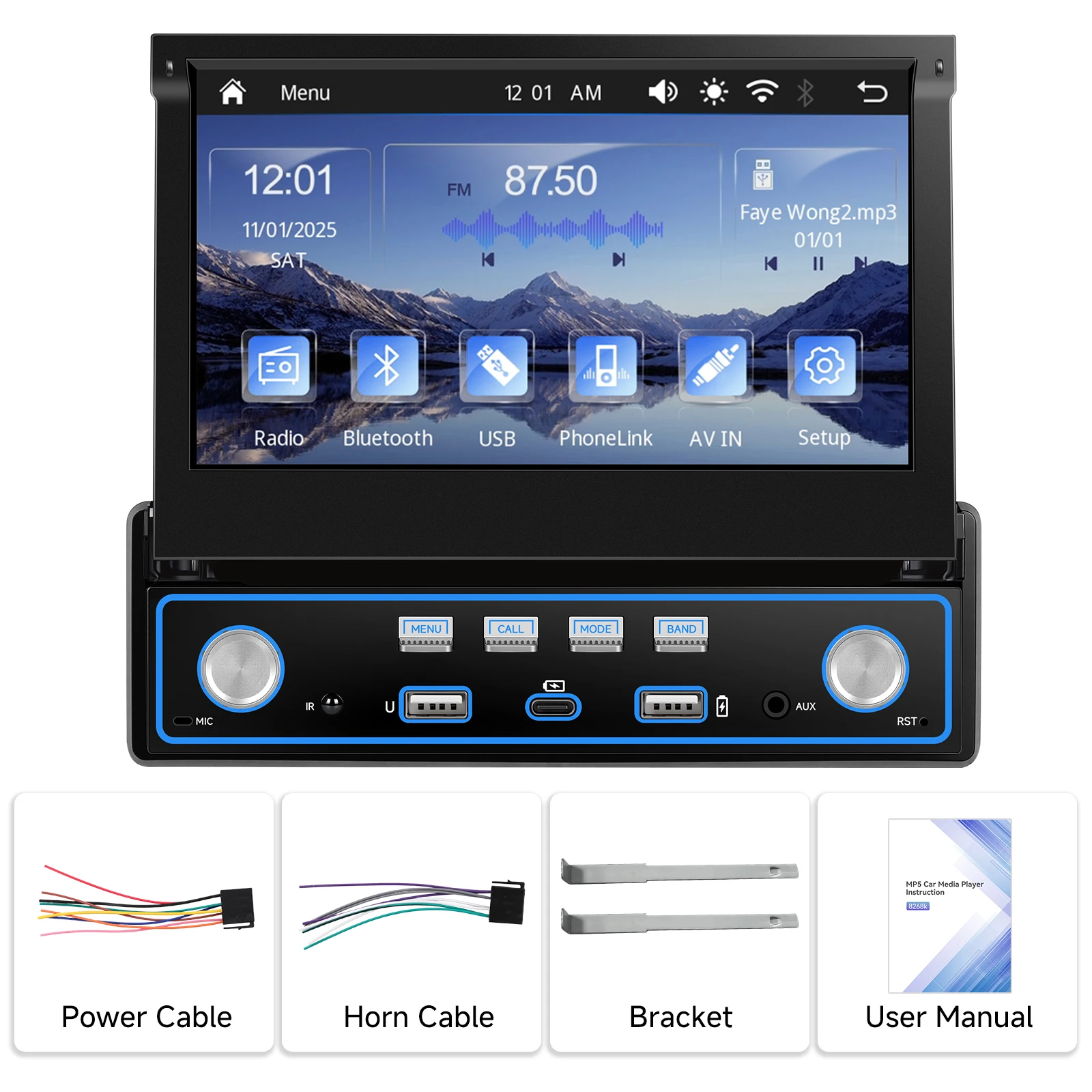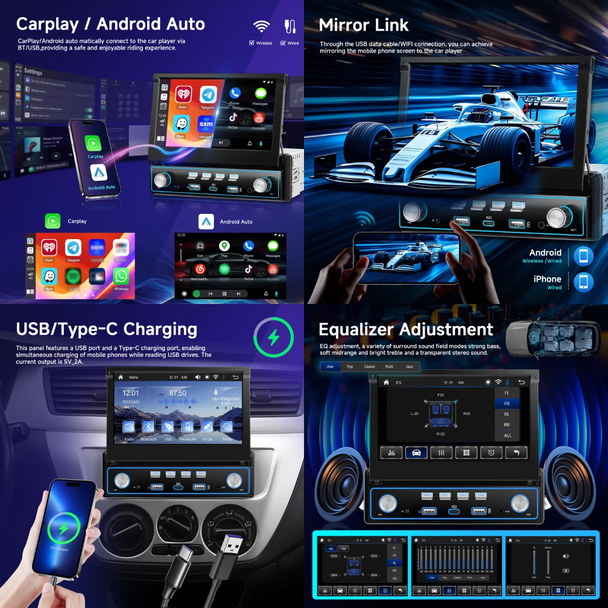 - Mirror Link: Use phone apps, music, videos on car display via USB or WiFi