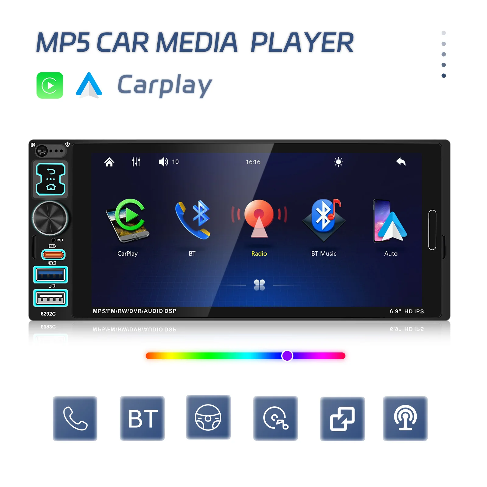 Podofo Universal 1 DIN 6.9 Inch Car MP5 Player Wired Carplay Android Auto Car Radio EQ Remote Control Car Stereo Factory OEM/ODM A4342