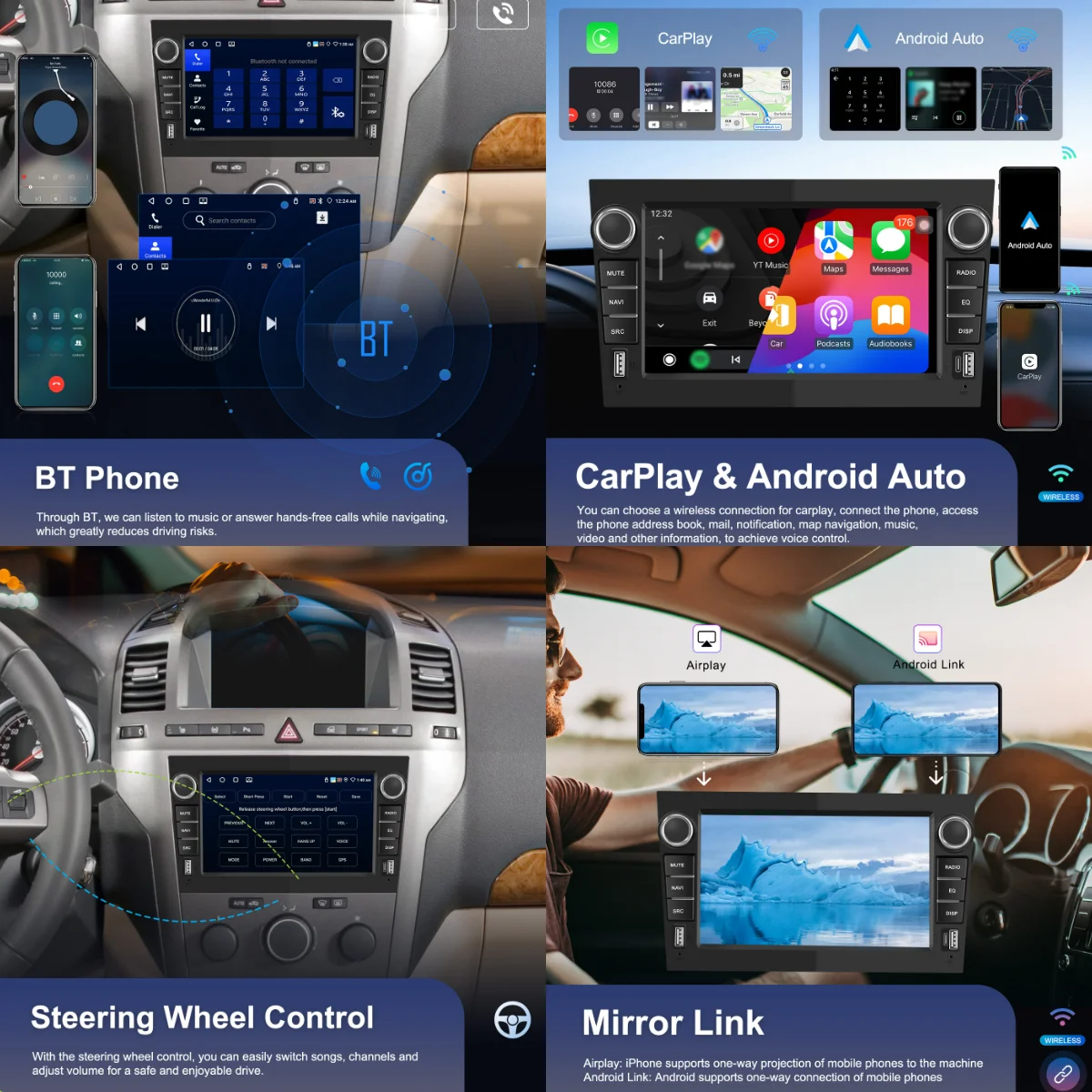 ●Wireless Carplay and wireless Auto: Connect your smartphone to the car system, providing access to Google Assistant, navigation, calls, and messages. It offers a user-friendly interface, promoting safe driving by enabling voice commands and easy access to essential apps.